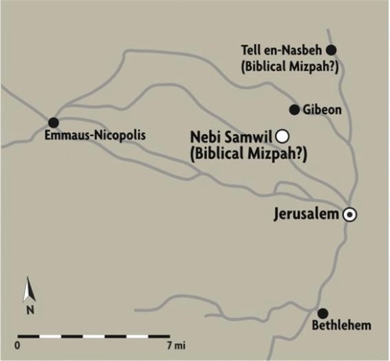 미스바와 기브온은 성경에서 자주 함께 등장한다. 이는 지리적으로 두 지역이 근접한 곳에 있음을 뜻한다. 예를 들어 느헤미야 3장 7절에서 ‘기브온과 미스바 거민들이 함께 예루살렘 성벽 재건을 도왔다.’라고 기록되어 있다. 네비 삼윌과 기브온(현대 지명: 엘-지브)는 1.6km의 비교적 근거리에 있는 반면 앞에 언급한 텔 엔-나쉐는 기브온으로부터 거의 5km나 떨어져 있다.