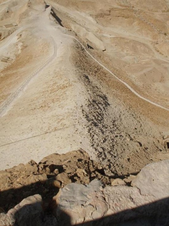 C. 마사다는 높이가 450m이고 거대한 원기둥을 잘라 놓은 듯한 모습을 하고 있기 때문에 밑에서 위로 접근하기가 쉽지 않은 지형을 갖추고 있어, 말 그대로 천혜의 요새 그 자체이다. 케이블카로 정상에 올라가 보면 길이 600m, 폭 250m의 평평한 지형에, 많은 사람이 은신할 수 있는 장소와 건물들이 있던 흔적을 볼 수 있다.